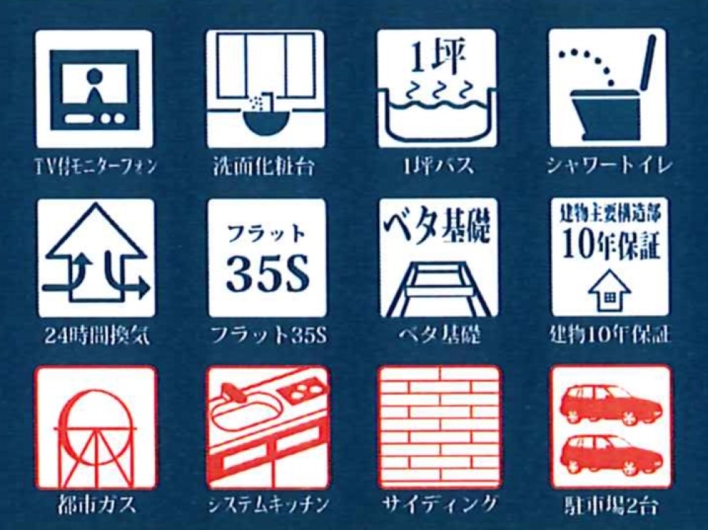 特徴 2面採光 24時間換気システム 高気密高断熱住宅 外壁サイディング 制震構造 整形地 閑静な住宅街