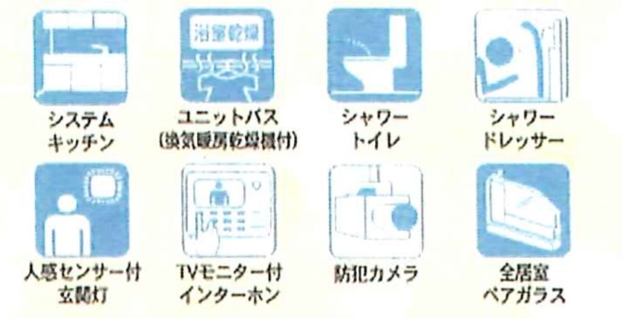 下水道 ダブルロックドア モニタ付インターホン ディンプルキー 防犯カメラ 火災警報器(報知機) ルーフバルコニー 駐車場2台分