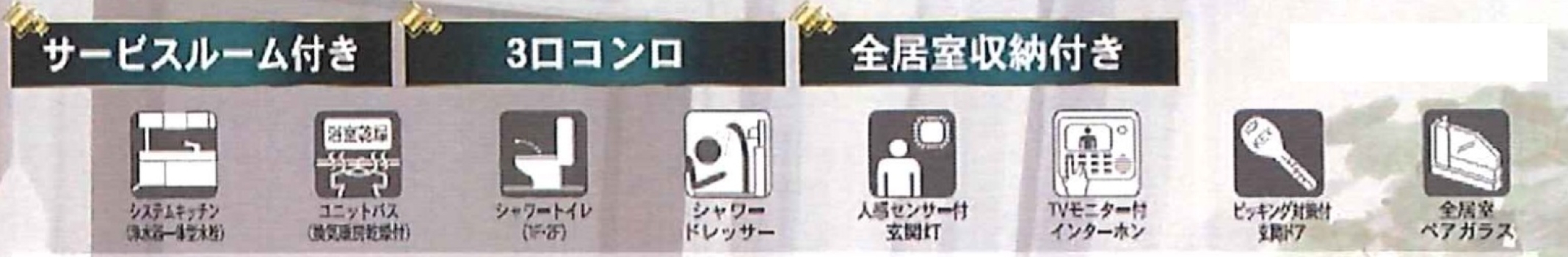 3口以上コンロ 独立型キッチン システムキッチン グリル 浄水器 全居室収納 クローゼット シューズIC 床下収納 人感センサー付照明 省エネ給湯器 プロパンガス 複層ガラス 電気 上水道 下水道 ダブルロックドア