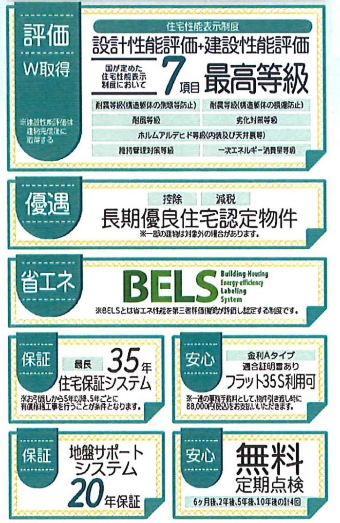 特徴 2面採光 24時間換気システム 高気密高断熱住宅 外壁サイディング 制震構造 整形地 設計住宅性能評価書